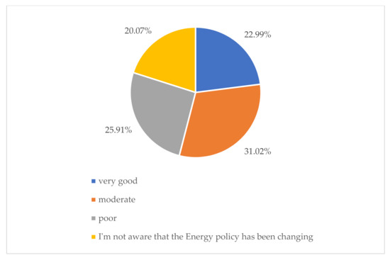 Afterwards, respondents were also asked to assess their knowledge of the assumptions of the draft Energy Policy of Poland until 2040 (still in the project phase at the time of the survey). 63 respondents (22.99%) assessed their knowledge as very good, 85 (31.02%) moderate, and 71 (25.91%) poor. 55 (20.07%) respondents were not aware that the Energy Policy of Poland has been changing (see Table 3 and Figure 10).