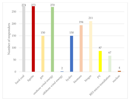 The respondents were also asked whether they knew what Poland’s energy mix currently looks like, and their task was to tick the energy sources currently used in Poland (each respondent could select more than one answer). All respondents ticked hard coal (274, 100%) and almost all respondents (273, 99.64%) ticked lignite. A vast majority also ticked onshore wind energy (270, 98.54%), biogas (211, 77.01%), and biomass (194, 70.80%). A total of 150 (54.74%) respondents ticked gas and hydropower. Only 87 (31.75%) respondents selected photovoltaics and 67 (24.45%) ticked RES micro installations. Furthermore, 4 (1.46%) respondents ticked nuclear power, while 2 (0.73%) ticked offshore wind energy (see Figure 11).