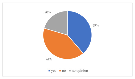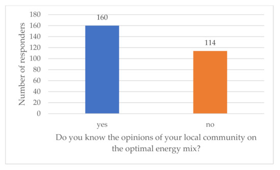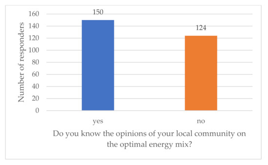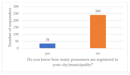 The respondents were also asked whether they knew what opinions the local community in their city/municipality had on the optimal energy mix (Figure 13). A total of 160 (58.39%, of which 41.25% were residents from urban municipalities, 25.63% were from cities with country rights, 23.75% were from urban and rural municipalities, and 9.38% were from rural municipalities) said yes, while 114 (41.61%, of which 67.54% were residents from urban municipalities, 16.67% were from cities with country rights, 8.77% were from urban and rural municipalities, and 7.02% were from rural municipalities) said no. Another question concerned the knowledge of the number of prosumers registered in the respondents’ city/municipality (Figure 14). The vast majority (240, i.e., 87.59%, of which 59.17% were residents from urban municipalities, 24.17% were from cities with country rights, 15.42% were from urban and rural municipalities, and 1.25% were from rural municipalities) responded in the negative, while 34 respondents (12.41%, of which 2.94% were residents from urban municipalities, 5.88% were from cities with country rights, 32.35% were from urban and rural municipalities, and 58.82% were from rural municipalities) had knowledge on this figure. The respondents were also asked to say whether they had ever heard of energy cooperatives (Figure 15). A total of 150 respondents (54.74%, of which 42.67% were residents from urban municipalities, 27.33% were from cities with country rights, 20.00% were from urban and rural municipalities, and 10.00% were from rural municipalities) affirmed, while 124 (45.26%, of which 63.71% were residents from urban municipalities, 15.32% were from cities with country rights, 14.52% were from urban and rural municipalities, and 6.45% were from rural municipalities) had never heard of them.