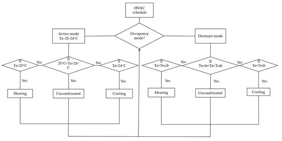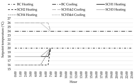 Figure 2 shows the flow chart of the implemented control logic. Furthermore, Figure 3 presents the simulated control strategies. The base case (BC) schedule applied setpoint temperatures within the thermal comfort range of 20–24 °C at all times. Hence, heating started when the temperature fell below 20 °C, whereas cooling began when the temperature raised above 24 °C. Schedule 1 (SCH1) introduced heating and cooling setback temperatures of 18 and 26 °C during the dormant hours in winter and summer, respectively. The goal of this control strategy was to, on the one hand, increase heating and cooling energy savings, and on the other hand, facilitate the phase change transition of the modeled microencapsulated PCM (see Section 2.1). However, our previous research showed the pronounced hysteresis effect of hempcrete-PCM composites. As a result, the solidification of the modeled MPCM starts at lower temperatures of around 16 °C [40]. Therefore, Schedule 2 (SCH2) further reduced the heating setback temperature to 16 °C and kept the cooling setback temperature to 26 °C. Schedule 3 (SCH3) applied heating setback temperature ramp-up and cooling setback temperature ramp-down of 0.5 °C every 30 min from 05:00 to 07:00 to avoid the heating and cooling energy peaks in the morning hours. Finally, Schedule 4 (SCH4) implemented a heating setback temperature ramp-up of 1 °C every 30 min from 05:00 to 07:00 while maintaining the cooling controls from SCH3.