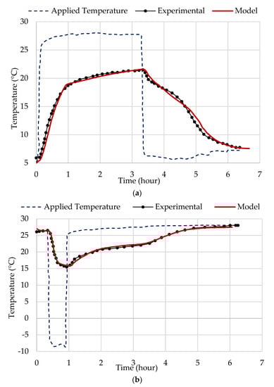 Confidence in the numerical modeling of the hysteresis effect required validation against the experimental results. In this regard, the developed hysteresis model is validated against the experimental results presented in [50]. In this study, researchers applied a temperature step change for heating and cooling modes on a bio-based PCM product to measure its temperature change and observe the interrupted phase change process. Thus, the same temperature step profile (see Figure 5), geometry, and PCM properties, presented in Figure S3 and Table S2 of the Supplementary Materials, were simulated. The numerical predictions were then compared against experimental measurements provided in [50]. The hysteresis modeling section in the Supplementary Materials presents additional information about the developed model and validation approach. Figure 5 shows a good agreement between the numerical and measured temperatures (with RMSE of 0.65 and 0.35 °C for heating and cooling, respectively, and a maximum temperature difference of 1.1 °C in both cases) and nearly the same profile behavior for temperature change. Consequently, the developed hysteresis model can accurately simulate the interrupted freezing and melting of the PCM.
