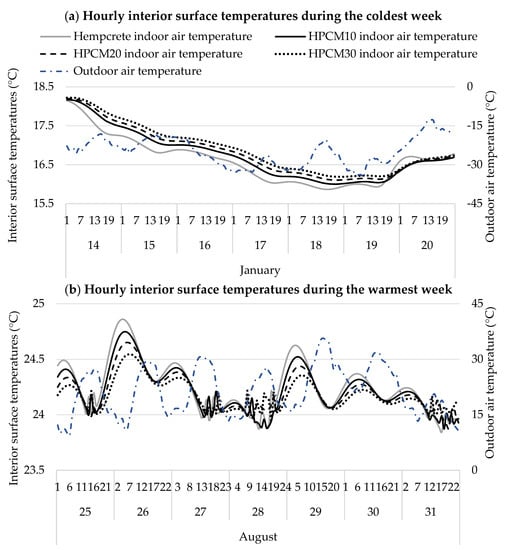 Table 3 summarizes the interior (i.e., wall surface in contact with the air) temperatures’ descriptive statistics for the wall cases. Additionally, Figure 6 compares assemblies’ hourly wall surface temperatures during the coldest and warmest weeks. The findings suggest that HPCM walls maintained higher wall surface temperatures during the coldest days, lower during the warmest days, and within a tighter range than hempcrete. For example, as presented in Figure 6a, HPCM wall types provided 0.1 to 0.6 °C higher temperatures than the hempcrete wall assembly during a week with the lowest outdoor air temperatures in January. Similarly, HPCM wall types kept approximately 0.2 to 0.4 °C lower temperatures during the warmest summer days than the hempcrete wall. These findings support the results of previous studies about the ability of PCM-enhanced envelope components to maintain more comfortable indoor conditions compared to the conventional building envelope systems in the cold region [52].