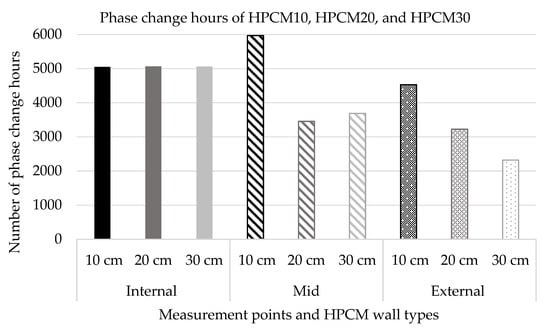- The results also show that phase change hours of HPCM layers reduce significantly (~30–50%) beyond 10 cm (i.e., HPCM10), and the reasons are twofold. First, because microencapsulated phase change material was selected to perform during the heating season and thus has a low operating phase change temperature of 18 ± 1 °C, it stayed melted most of the summer in all wall types. Second, due to the low average winter temperatures of −15 °C or colder, MPCM stayed solid most of the winter in the wall sections of HPCM20 and HPCM30 close to the exterior environment. Therefore, future work should explore adding insulation on the exterior of the wall to improve the performance of the HPCM. Additionally, the follow-up study should investigate the application of MPCMs with higher melting temperatures that will perform well during the warmer months.