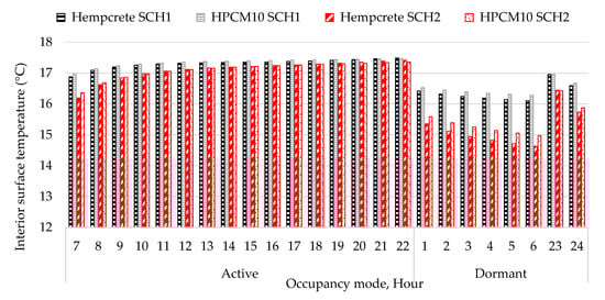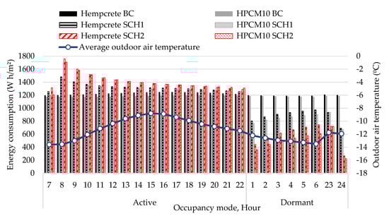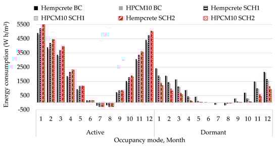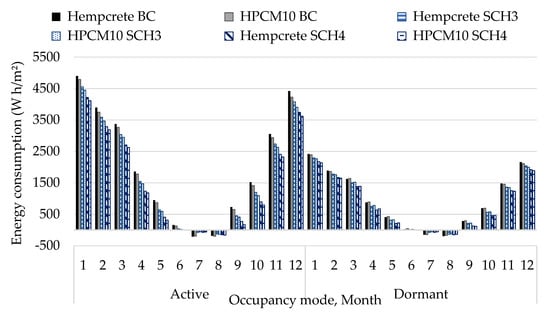 Further understanding of the hempcrete and HPCM10 wall type performances requires analyzing monthly and hourly energy consumption and interior surface temperatures. In this respect, Figure 8 presents the average monthly heating and cooling energy consumption during active and dormant periods for hempcrete and HPCM10 walls under BC, SCH1, and SCH2 control strategies. As presented, both walls exhibited higher energy consumption under SCH1 and SCH2 than BC during active hours. Thus, the energy consumption of the hempcrete wall was 123–303 and 137–600 W h/m2 higher under SCH1 and SCH2, respectively, than BC.