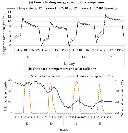 Furthermore, Figure 11b illustrates that outdoor air temperatures significantly declined over the presented period from the average of −3 °C on the 12th to −22 °C on the 15th. Contrastingly, all four days had high solar radiation (~23–31% lower than the annual maximum 1128 W/m2), especially the 12th with the maximum of 870 W/m2. Hence, the phase change material in the HPCM10 melted and absorbed solar energy during the less cold and sunny winter days of the 12th and 13th, at the expense of higher energy input of the heating system compared to the hempcrete case. Previous studies support the explanation that phase change materials sometimes can increase energy consumption due to the absorption of the thermal energy (e.g., solar radiation) that otherwise would heat the space and reduce heating requirements [53]. Then, when outdoor air temperature declined on the 14th and 15th, the HPCM10 wall released the stored heat back to the interior space, reducing energy consumption compared to the hempcrete wall.