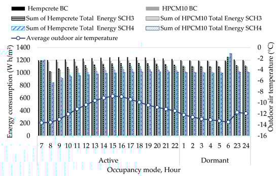 Figure 9 shows the average hourly walls’ energy consumption under three schedules during active and dormant hours from November to March. The most significant increase in the walls’ heating energy consumption under SCH1 and SCH2 compared to the BC schedule occurred in the early morning hours when the outdoor air temperatures were at their lows and heating setback temperature changes to the setpoint (see Figure 3). Furthermore, because of the higher difference between setback and setpoints of 4 °C, SCH2 had a more pronounced energy peak at 08:00 than SCH1. In contrast, at night, both walls had a significantly lower energy consumption under SCH1 and SCH2 than their counterparts under the BC scenario. Furthermore, the HPCM10 wall type outperformed the hempcrete case during dormant hours. In this respect, the HPCM10 case had 5–7% and 16–20% lower average hourly energy consumption than the hempcrete wall type at night under SCH1 and SCH2, respectively.