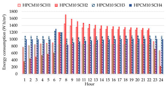 Average hourly heating energy consumption of HPCM10 wall under four schedules.