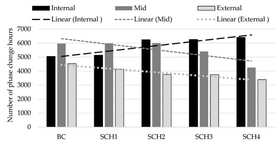 Figure 15 provides additional insights into the performance of the HPCM10 wall type through the investigation of the phase change hours in the three layers—internal, mid, and external—under all five investigated control strategies. As presented, the phase change hours of the inner layer increased as the control strategies changed from the BC schedule to SCH4, and the opposite applied to the middle and exterior layers of the HPCM10 wall assembly. Hence, the interior layer exhibited 24% (SCH2 and 3) to 27% (SCH4) more phase change hours than the BC controls. The middle section performed the best under BC, SCH1, and SCH2 with approximately 6000 phase change hours, and the worst under SCH4 and SCH3 with 9% and 29% fewer hours, respectively. The external layer performed the best under the BC scenario owing to its distance from heating controls, followed by SCH3 and SCH2 with approximately 17% and SCH4 with 25% fewer phase change hours. Considering that the layers closer to the indoor space have the most considerable impact on the interior temperatures and thermal comfort, these results suggest that the HPCM10 wall performed better under SCH2, SCH3, and SCH4 controls compared to the BC and SCH1 strategies.