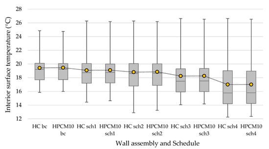 Finally, Figure 16 graphically depicts and compares the interior surface temperature distributions of hempcrete and HPCM10 wall types through their quartiles, averages, and variability outside the upper and lower quartiles. As presented, both wall types had the least variable interior surface temperatures under the BC schedule, whereas the temperatures of SCH4 exhibited the most significant degree of dispersion. These results are due to tighter setpoint and setback temperature ranges implemented in the BC schedule than other control strategies. Furthermore, while hempcrete and HPCM10 walls show similar behavior for the same control strategy, the HPCM10 wall type consistently maintained higher temperatures and a tighter temperature range than the hempcrete assembly. Moreover, Figure 16 provides additional explanations for the differences in the phase change hours between the schedules (see Figure 15). In this respect, the hempcrete and HPCM10 wall types had the lowest average interior surface temperatures under SCH4 and the highest under the BC schedule. As a result, the middle and external layers of the HPCM10 wall had a lower number of phase change hours under SCH4 compared to other controls.
