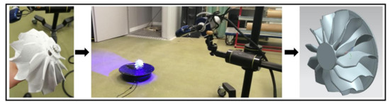 The turbine wheel was scanned using the AKON smartSCAN 3D HE scanner. The turbine was placed on the turntable and a total number of 60 scans were made during the 360° revolution of the turntable. After the scanning process, the scanned model was corrected using computer-aided design software. The geometrical features of the K44 turbine wheel are shown in Table 1 [29].