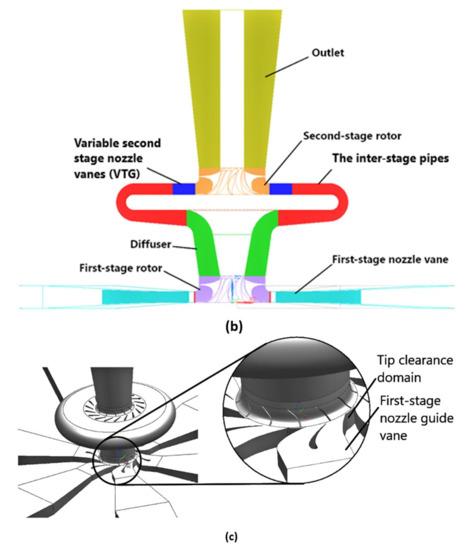 The cross-sectional view of the numerical model is shown in Figure 2b. The 2nd stage nozzle vanes were variable to control the backpressure in the upstream direction. The geometry of the 1st and 2nd stage turbine wheels was the same. The diffuser and inter-stage pipes were iteratively modeled to adjust the length and the cross-sectional area to reduce the pressure loss. The 1st stage nozzle vanes were set at the angle of 30°.