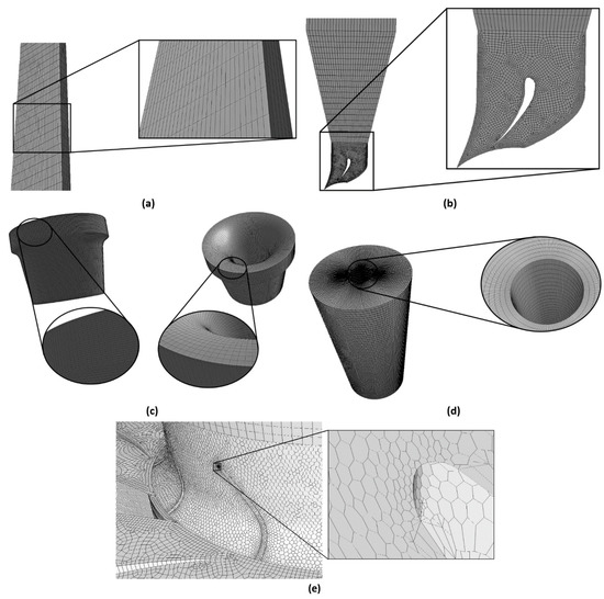 However, a polyhedral mesh was generated on both the 1st and 2nd stage rotors due to its complex geometry as shown in Figure 3e. The polyhedral mesh was chosen to reduce the number of the elements on both rotors without increasing the numerical error. The mesh was generated using the ICEM CFD software.