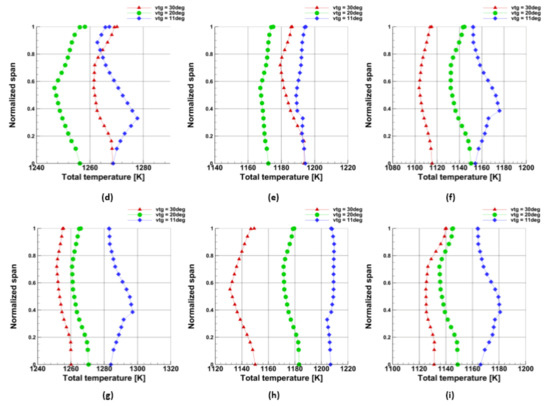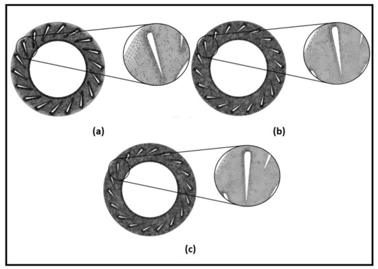 Figure 5 shows three different configurations of the VTG openings of the 2nd stage turbine wheel. For the research purposes, the 2nd stage turbine vanes were set at the three angles, i.e., 30°, 20°, and 11°, which represents the maximal opened, medium, and maximal closed position of the variable vanes. Figure 6 shows the mesh of the VTG vanes for three different openings.
