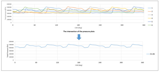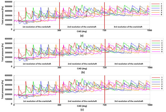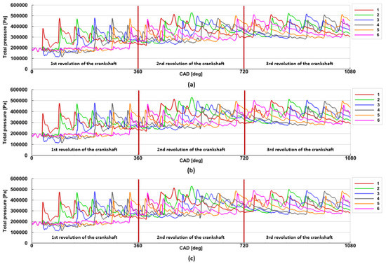 Figure 8 presents the pressure plot during the maximal opening of the VTG vanes. One can see that the pressure changes during the 3rd revolution of the crankshaft were almost the same for each exhaust pipe. In this case, pressure changed from 300,000 Pa to 510,000 Pa. The lowest, maximal pressure values were achieved at the turbine speed of 40,000 rpm for each opening of the VTG vanes. This was mainly caused by the higher leakage between the adjacent exhaust pipes during the exhaust phase. In each case, the pressure changes were almost equal for each exhaust pipe. That is why further results were presented during the 3rd revolution of the crankshaft. The authors decided to terminate the calculations at the end of the 3rd revolution of the crankshaft as the pressure differences for each exhaust pipe were within the range of 1–2%.