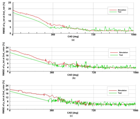 Figure 12 shows that the RMSE during the third revolution of the crankshaft reaches 2%, 3.9%, and 5% for 60,000, 50,000, and 40,000 rpm, respectively, which is the acceptable value for turbomachinery simulations.