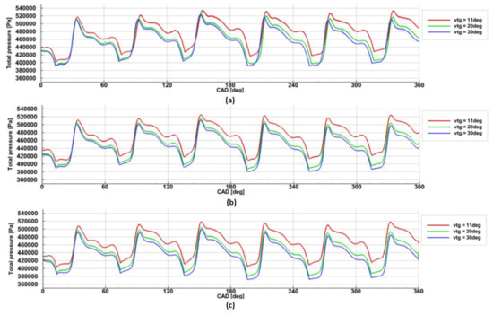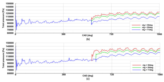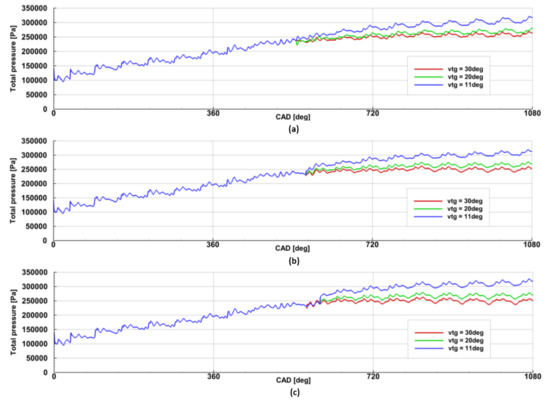 Figure 8, Figure 9 and Figure 10 show the pressure variations at the inlet to the 1st stage rotor for the three different turbine speeds and three different VTG openings during the three revolutions of the crankshaft.