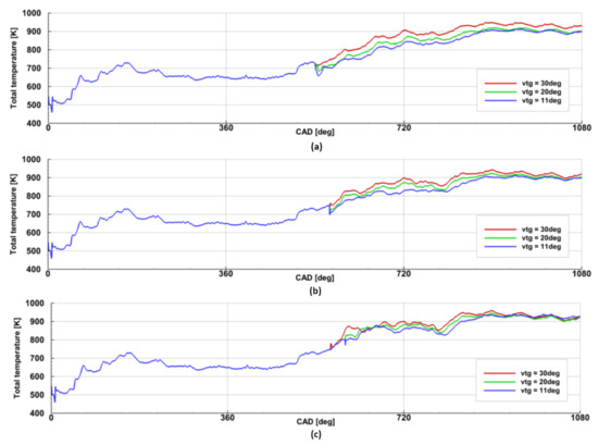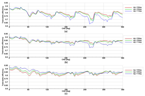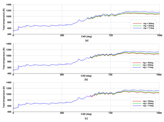 The key point of the research was the investigation of the model parameters during three different openings of the VTG vanes, as shown in Figure 5.