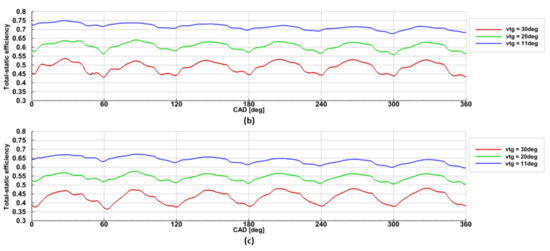 On the other hand, the efficiency of the 2nd stage rotor increased with the increase of the turbine speed. However, the average efficiency drop for the 1st stage rotor was 5%, while the efficiency increase for the 2nd stage rotor was 10%. That is why the 2nd stage rotor’s efficiency increase of the 2nd stage rotor balances the efficiency drop of the 1st stage rotor. It was also found that the position of the VTG had less influence on the efficiency of the 1st stage rotor than on the 2nd stage rotor. The maximal efficiency of the 2nd stage rotor was 75% for 60,000 rpm and 11° VTG position.