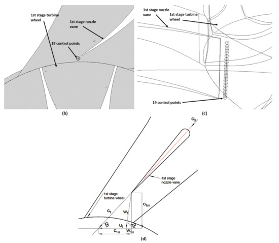 The positions of the VTG of the 2nd stage turbine wheel: (a) blade configuration (b) α3 = 30° deg, (c) α3 = 20° deg, (d) α3 = 11° deg.