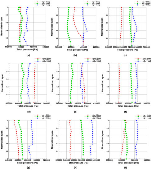 The plot of the total pressure at the 1-st stage turbine inlet for the 30° VTG opening at: (a) 60,000 rpm, (b) 50,000 rpm, (c) 40,000 rpm turbine speed.