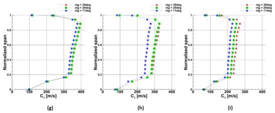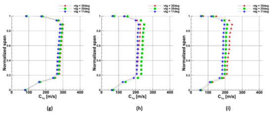 It was found that the pressure increased with the increase of the turbine speed and with the closure of the VTG vane. Such phenomenon was observed for the temperature changes. The analysis of the velocity parameters allowed to conclude that the optimal flow parameters were obtained in the mid-span of the nozzle vane at the maximal mass-flow rate and low turbine speed (40,000 rpm). In such a configuration, the relative angle of the relative velocity W1 is almost 90°. It provides a low incidence angle which is crucial to avoid pressure losses in the turbine inner-blade region.