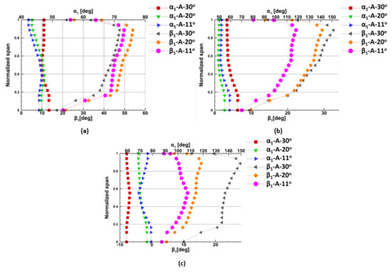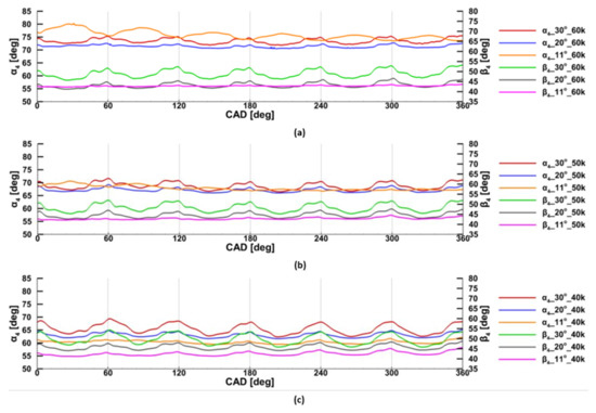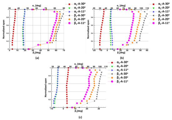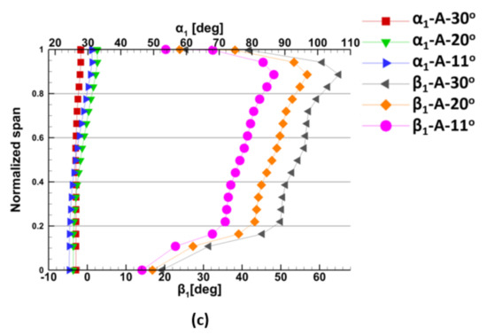 The absolute angle greatly depended on the turbine speed. Thus, with the increase of the turbine speed, the absolute angle increased, as shown in Figure 36a.
