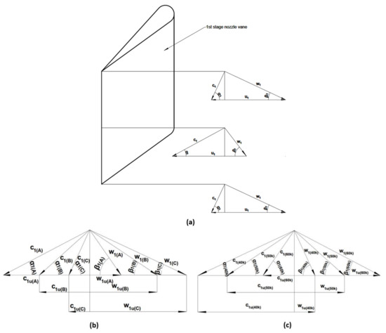 The absolute and relative angle at the outlet from the 2nd stage rotor for: (a) 60,000 rpm, (b) 50,000 rpm, (c) 40,000 rpm turbine speed.