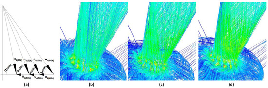 (a) Configuration of velocity triangles at the outlet from the 2nd stage rotor, (b) outlet velocity pathlines at 60,000 rpm, (c) outlet velocity pathlines at 50,000 rpm, (d) outlet velocity pathlines at 40,000 rpm.