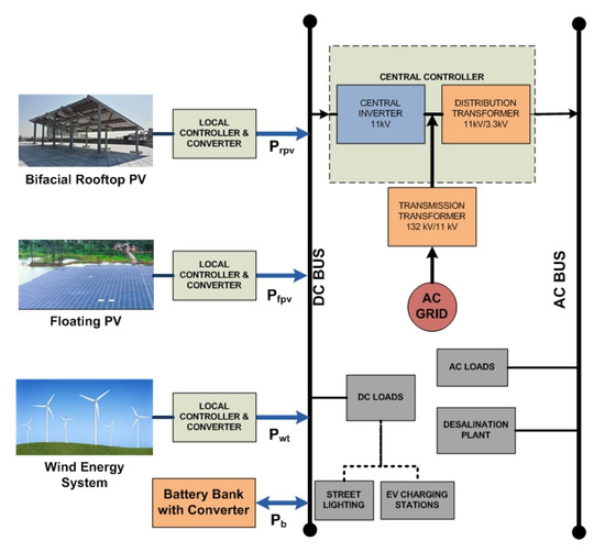 The proposed HRES with a battery bank is shown in Figure 3. The system contains decentralized rooftop PV panels, floating PV panels, and wind turbines installed over hilltops and seashores. Due to their intermittency, suitable converters are placed to integrate with the battery-integrated DC bus. The DC bus accommodates EV charging stations and street-lighting systems with which better efficiency is envisaged. A battery bank is also associated with the DC bus for charging and discharging during the mismatch between generation and load demand. Further, the DC bus is integrated with the AC grid through a transformer to supply the AC loads of the city. After matching the supply and demand, any excess power is wheeled to other load centers via the grid.