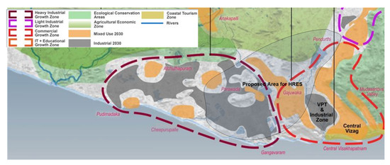Further, some of the power purchase agreements have already expired in 2019, while some power plants in the vicinity are close to their end of life. In contrast, renewable energy systems take only months to install and integrate with the grid and their capacities can be easily expandable at a faster pace. This study focuses on the city boundaries, where there is a drastic change in land usage and building cover due to the special economic zones. The type of housing is more inclined toward multi-story buildings where rooftops are under-used or individual houses with sufficient space for solar installations. The GVMC can propose a public–private partnership model with those rooftop owners and hence reduce the leasing costs of rooftop solar power systems. Besides, water bodies are explored to enable the interested parties to invest in floating solar PV systems. This will also benefit the city with reduced water evaporation as the city is struggling for water security for decades. Likewise, wind energy systems can be mounted on shorelines and hilltops. Based on the master plan provided by the infrastructure firm AECOM [49], growth centers and human settlements in the proposed city are shown in Figure 4.