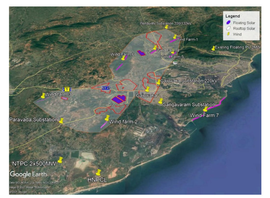 It is observed that the industrial activities in Parawada and Atchutapuram areas have enabled satellite growth centers, marked by orange stripes, to grow at a faster rate, in addition to the expansion of the city core. Given this, the area marked with grid lines is taken for the proposed area for the HRES to be set up. Assessment of HRESs is done at the proposed location using the Polygon tool of Google Earth Pro, where purple and blue patches along with yellow pins indicate potential areas for floating PV, rooftop, and wind energy system installations, respectively, as shown in Figure 5.