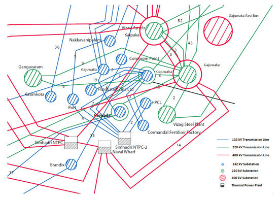 Four potential areas for floating PV systems, are identified and their areas are calculated. Similarly, six possible areas for rooftop solar power systems are recognized after taking out unused land cover and dense areas where the installation is not viable. Further, the potential of wind energy systems is assessed over hilltops with a minimum of 200 m height in the region and on the shorelines that are not part of any economic activity. The potential of each HRES is given in Table 2, along with the potential quantity of solar panels and wind turbines. These values are considered as the upper bounds for optimal sizing of the HRES. Further, accessibility of the HRES to the grid is assessed, as shown in Figure 6 [50], through which concerns regarding grid connectivity are addressed. The proposed location has a good number of substations with 132 kV, 220 kV, and 400 kV voltage levels. The entire energy in the HRES can be evacuated through these substations.