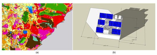 (a) Land cover of the proposed area. (b) Shading analysis of a proposed rooftop PV configuration over a building.