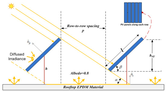 There are a total of three components of irradiance that fall on the front and rear sides of the bifacial panel, i.e., direct normal irradiance (DNI), diffused horizontal irradiance (DHI), and an albedo, due to reflected irradiance, as shown in Figure 9. The total irradiance on the PV panels is given by Equation (2).