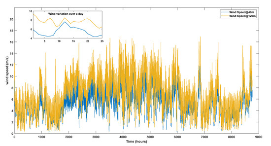 The wind speeds at the proposed location are obtained from weather stations and are extrapolated to the required height using Equation (7). The power generated from the WECS can be obtained using Equation (8) [10]. Per the technical details of wind turbines provided in Section 3, a capacity use factor of ~40% can be achieved.