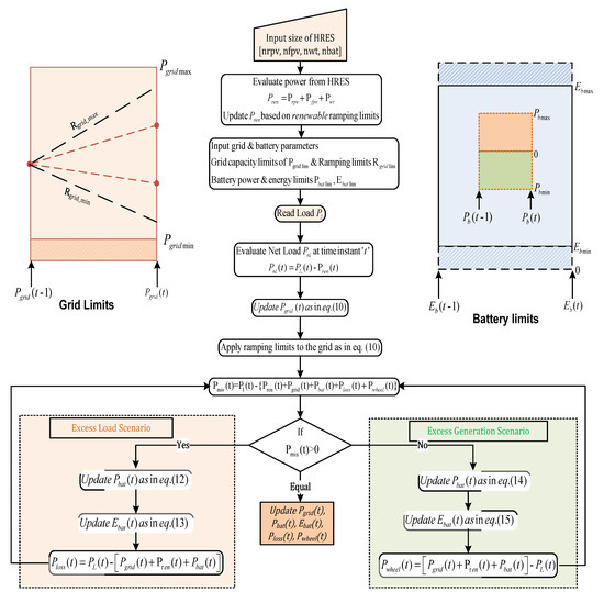 The flowchart for the EMS is shown in Figure 11. Initially, the size of the renewable energy system is fed to the EMS and the corresponding powers are calculated. The ramp rate limitations of the thermal power plants, battery power, and energy limitations are considered. Using these, the net power mismatch is calculated for the given load at any given instant. Then, power dispatch based on the two scenarios of power mismatch, excess load and excess generation, is carried out.