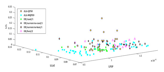 Based on the assessed potential in Section 2, optimal sizing of the HRES is achieved to minimize the LPSP, LCoE, and LCL. ALA-QPSO techniques are applied, and the results are compared with four other benchmark techniques, four variants of differential evolution (DE) algorithms. The adopted algorithm is compared with variants of DE as it has proven to be an effective optimization technique for enhancing the exploration of the population. The optimization parameters for the algorithms under comparison are presented in Table 4. The same values are chosen for parameters, wherever necessary, for all the algorithms to prove the effectiveness of the proposed algorithm. The results are screened further based on the minimum LPSP, as shown in Table 5. The result obtained is shown to be near optimal as the combination fared well in most of the constraints that include the least number of hours of load loss and the least number of hours of excess generation. This will result in better profitability of the proposed system.