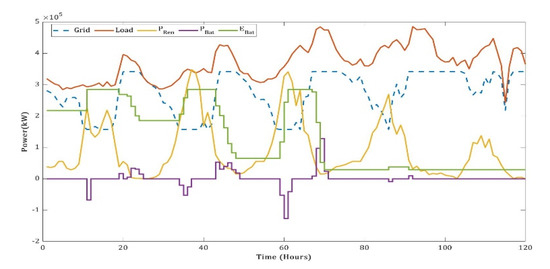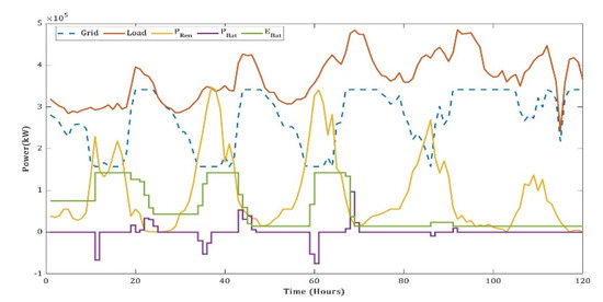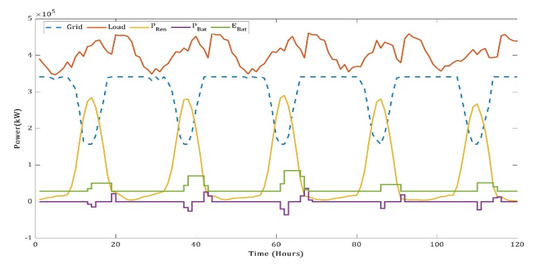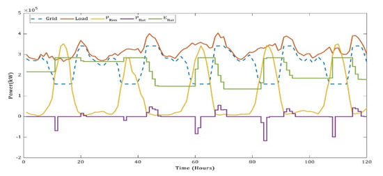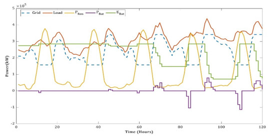 The quantity of power accessed from the grid follows Equation (10). The grid compensates the net load after the load is met by renewable energy. However, the grid is limited by ramping rates and then the maximum capacity.
