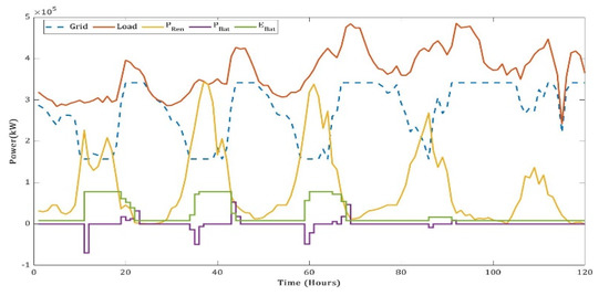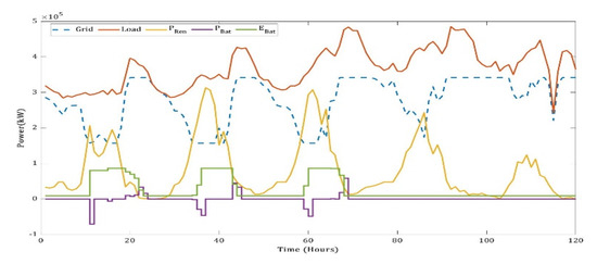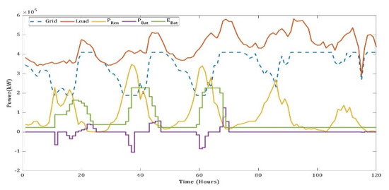 During this time, the BESS has helped in maintaining the frequency of the grid constant by compensating for any generation loss by the PV system. It should also be noted that the participation of battery power in the proposed system is mostly during the violation of ramp rate limits, in the early morning or in the evening. Hence, we notice that at noon, ramp rates are not violated the power dispatch from the grid is at its technical minimum. This shows that the higher penetration of variable renewable energy sources into the grid brings down the plant load factor of thermal power plants. Hence, if BESSs are not used during the violation of ramp rate limits, it may burden the TPPs further in the event of phasing-out of diesel- or gas-based plants. Similarly, the power distribution for June with mutation-based ALA-QPSO is plotted in Figure 18 for the minimum LCoE configuration. Here, the month of June is selected, as solar power undergoes wide changes during that month.