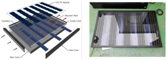 The PVT design concept was proposed to improve thermal performance considering two main elements. The first was to maximize the absorption of solar radiation. For this purpose, a G/G (Glass to Glass) PV module with different arrangements of the PV cells to improve accumulated heat passing through the transparent space between PV cells was used (Figure 1). The second element was to account for dynamic solar altitude due to different seasons. Therefore, curved baffles made with absorber plates were installed between PV cells in the collector. The shape of baffles was designed to maximize absorbed solar radiation with different incident angles and to collect heat efficiently. The baffles created efficient air movements and absorbed heat as obstacles. As a result, air would swipe the back side of the PV module to effectively cool it down.