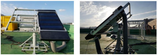 An outdoor experiment for the air-type PVT collector was carried out under steady state conditions based on ISO 9806. The experimental setup was installed on the campus of Kongju National University, Cheonan City, South Korea. The collector was mounted on a solar tracker, which can be controlled on the x and y axis. The headers were fixed on the top and bottom of the collector to circulate air fluid. The experiment was an open loop system that uses ambient air for the PVT inlet, and PVT outlet air is exhausted outside. PVT inlet temperature can be set in the chamber. The air was blown into the inlet header of the collector and exited through the outlet header (Figure 2).