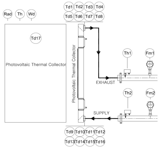 Thermocouples, humidity sensors (Th1, Th2), and air flow meters (Fm1, Fm2) were installed to measure temperature, humidity, and air flow data for the experiment. The pyranometer was located 1 m beside the air-type PVT collector at an equivalent degree (Figure 3). Furthermore, 8 point temperature sensors were set at the inlet and outlet ducts of the collector to check the temperature uniformity. The experimental conditions were solar radiation greater than 700 W/m2, a flow rate of 80 kg/h, and fluctuation of the inlet, outlet, and ambient temperature within ±0.5 °C. Electrical performance was analyzed at the same operational conditions. The inlet air temperature was set between 20 and 40 °C.