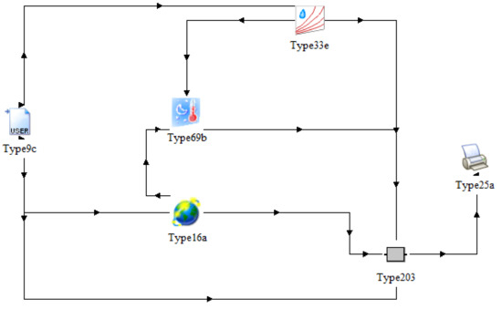 Annual simulations using TRNSYS were conducted to analyze the long-term performance of the collector with type 203 component, which was developed by CanmetENERGY in Natural Resources Canada and Kongju National University, funded by an international cooperative research project. TRNSYS is a simulation program used for modeling buildings and equipment, including alternative energy systems such as solar, photovoltaic, wind, etc. The simulations are constructed by connecting components models to compute performance. A simplified flow diagram and setup of the PVT system in the TRNSYS environment are shown in Figure 4.