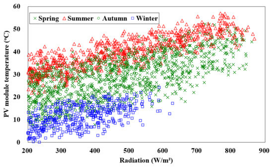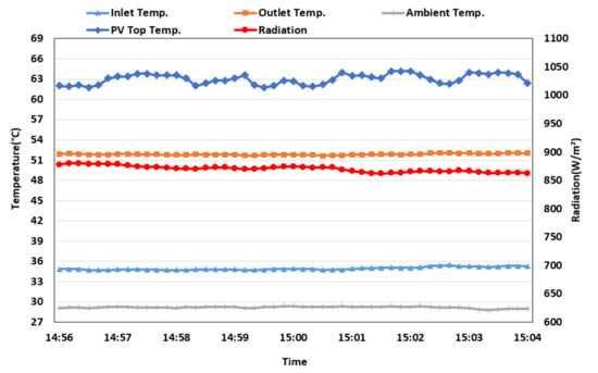 Figure 5 shows the temperature characteristics of the air-type PVT collector. The outlet air temperature of the collector was 53 (±0.5) °C when the inlet temperature, radiation, and flowrate were 35 (±0.5) °C, 870 (±30) W/m2, and 80 kg/h, respectively. The temperature difference (∆T) between inlet and outlet was 18 (±0.5) °C when the PV top temperature was 63.5 (±1) °C.