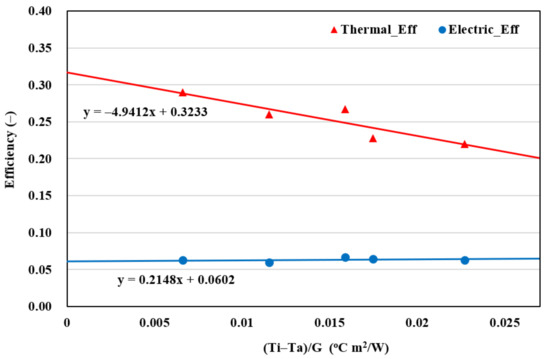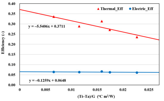 Thermal and electrical efficiencies of the air-type PVT collector are plotted in Figure 6. In Figure 6, the X axis is a coefficient determined in relation to ambient temperature, inlet temperature, and radiation. Similarly, the Y axis is the thermal and electrical efficiencies of the collector. Conventionally, equations of the form y = ax + b are used to characterize the performance coefficient for the PVT collector. The efficiencies were calculated using Equations (1) and (2). Based on collector area and when there were no heat losses (temperatures of inlet and ambient were equal), the thermal and electrical efficiency of the air-type PVT collector were 37.1% and 6.5% (referring to the coefficient of b for thermal efficiency and electrical efficiency equations in Figure 6), respectively. There was no decrease in electrical efficiency as the air carried away heat from the back side of the PV module.