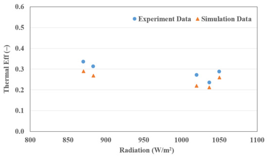 According to the simulation results, thermal and electrical efficiencies of the air-type PVT collector were 32.3% and 6.0% (referring to the coefficient of b for thermal efficiency and electrical efficiency equations in Figure 7), respectively, which were lower than for outdoor experiments (thermal efficiency of 37.1% and electrical efficiency of 6.5%). Although there were no electrical efficiency losses, the heat loss coefficient was 4.94 (from the coefficient of x for the thermal efficiency equation in Figure 7). Figure 8 and Figure 9 presents a comparison of simulation and experiment results. Thermal efficiencies based on simulation evaluations were 24–34%, while that for experiments were 21–29%, according to radiation. Electrical efficiencies were 6.1–6.5% for simulation evaluations and 5.9–6.8% for experimental assessments, at the same conditions. The simulation and experimental results showed similar patterns with changing conditions (radiation, ambient temperature, etc.). The bias error was −4% and −0.24% for thermal and electrical efficiencies, respectively.
