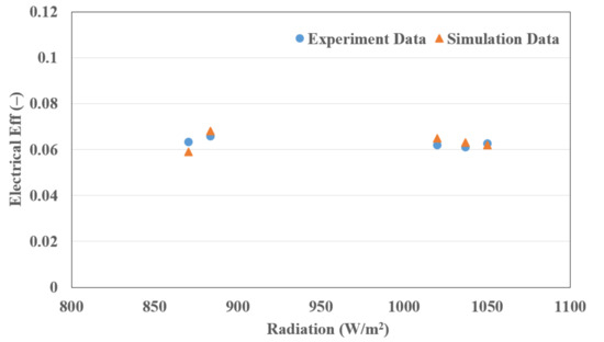 Comparison of electrical efficiencies for experimental and simulation assessments.