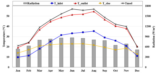 Figure 10, Figure 11 and Figure 12 show the annual temperature variations for the PVT collector. The temperature at the back side of PV continuously increased and peaked in June and August at 56 °C. The ambient air was used as an inlet medium to take heat from the PVT collector into the collecting space. The outlet temperature increased to a maximum of 55 °C in August when inlet air temperature, solar radiation, and flow rate were 35 °C, 880 W/m2, and 80 kg/h, respectively. Temperature rise (∆T) was dominant from May to July at 23 °C, and lowest in December at 13 °C.