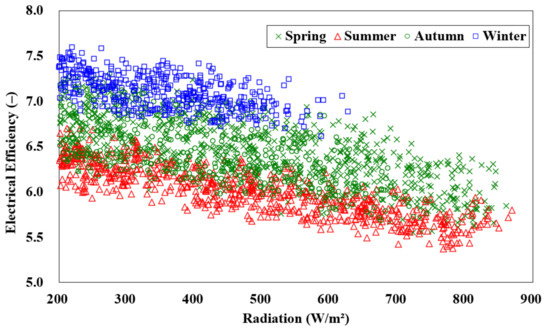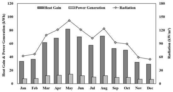 Seasonal heat gains and power generation were 198.97 kWh th, 33.63 kWh el (June–August, summer), 99.12 kWh th, 21.27 kWh el (December–February, winter), 211.19 kWh th, 38.54 kWh el (March–May, mid-term 1), and 134.80 kWh th, 25.24 kWh el (September–November, mid-term 2). Heat gain and power generation of mid-term 1 were higher than summer because of the rainy season in July. Annual heat gain and power generations were 644 kWh th/year and 118 kWh el/year, respectively (Figure 13).