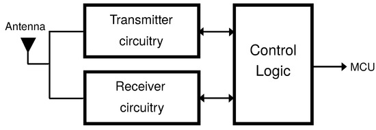 Figure 1 depicts a simplified block diagram for a WSN communication module, based on four IEEE 802.15.4-compliant radios modules (CC2420 [36], CC1120 [37], MRF24J40 [38], and CC2520 [39]). Then, based on the simplified block diagram, four states were defined: transmitting, receiving, idle, and sleeping. When the module is in the transmitting state, the transmitter circuitry and the control logic block are active. In the receiving state, the receiver circuitry and control logic block are active. When the receiver and transmitter circuitry are turned off and the control logic block is turned on, the module is in the idle state. Last, when the receiver and transmitter circuitry are turned off and the control logic block is in the sleeping mode, the module is in the sleeping state.
